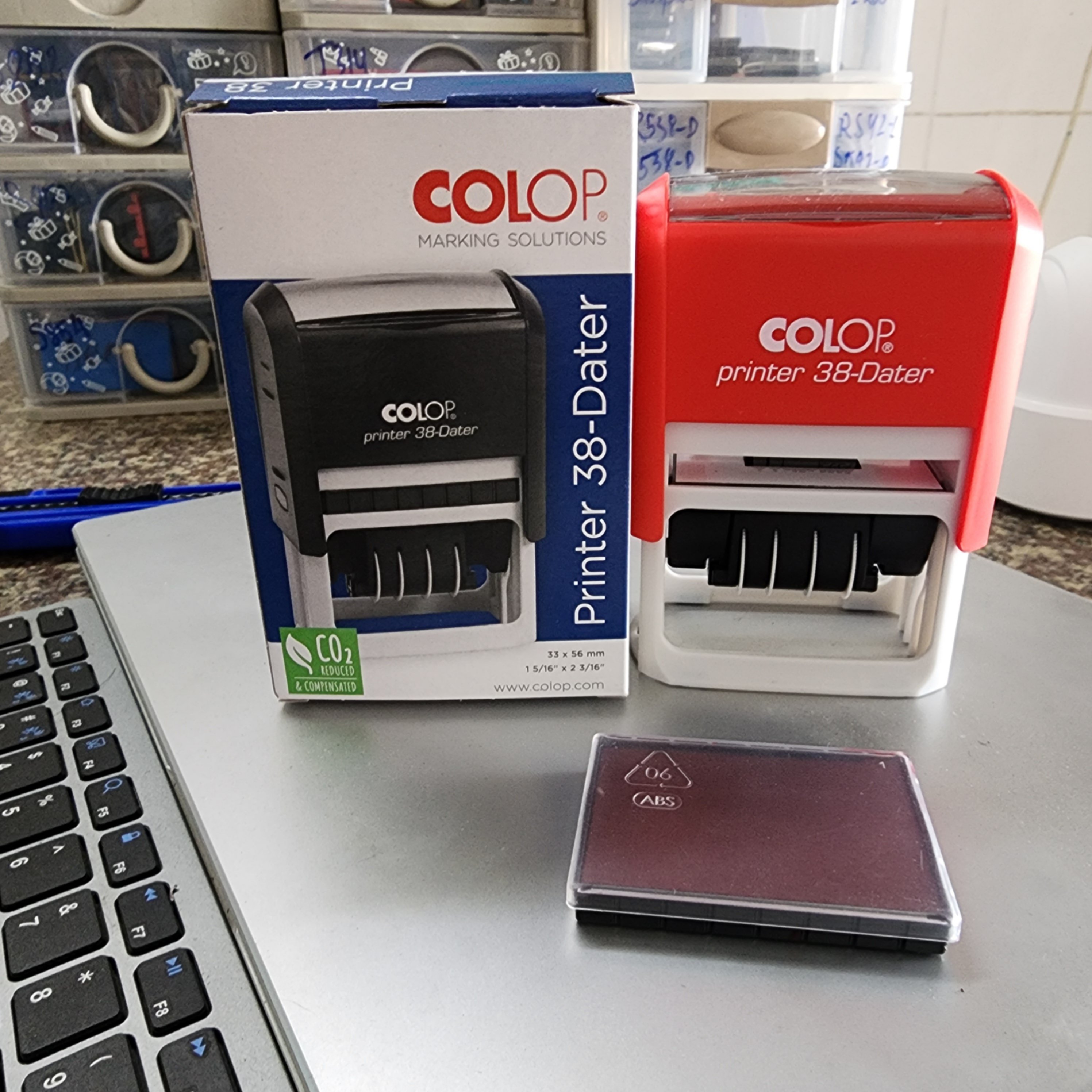 Mực thay thế: Có sẵn nhiều màu (Đỏ, Xanh, Đen, Xanh lá). Khi mực hết, chỉ cần thay thẻ mực Colop chính hãng, không lo lem mực.